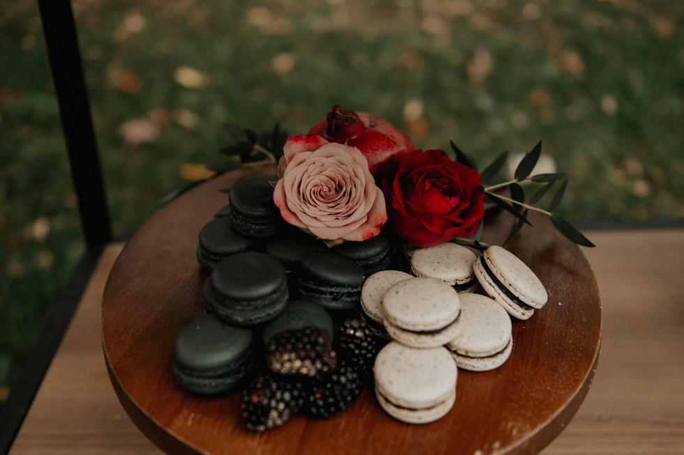 Fierce, right?! But we can't forget about the sweets! I knew I wanted the cake to be unique, so I sent our baker some inspo and she whipped up an incredible display! Rebecca from Four and Water Bakery never disappoints! Just look at the masterpiece she created for us! And those macarons were a perfect (and delicious) touch to the dessert display.